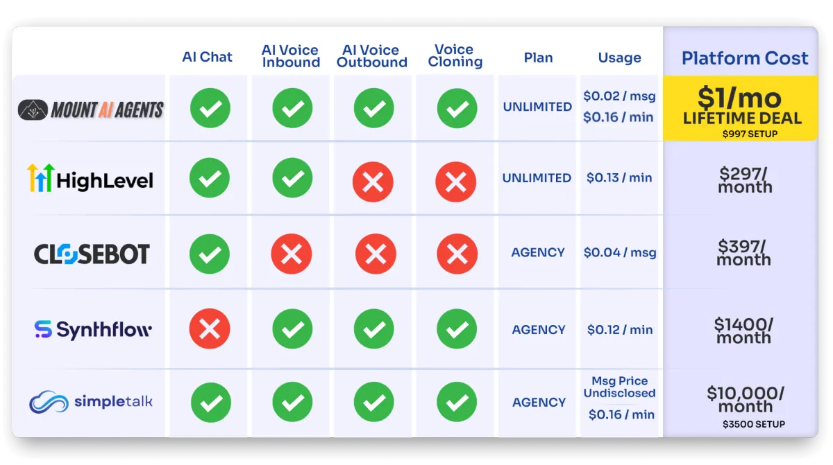 Mount Ai Agency is designed to give your business a massive competitive edge by helping you reduce costs, increase revenue, and provide premium AI automation services without saddling you with two and three thousand dollar subscription fees.